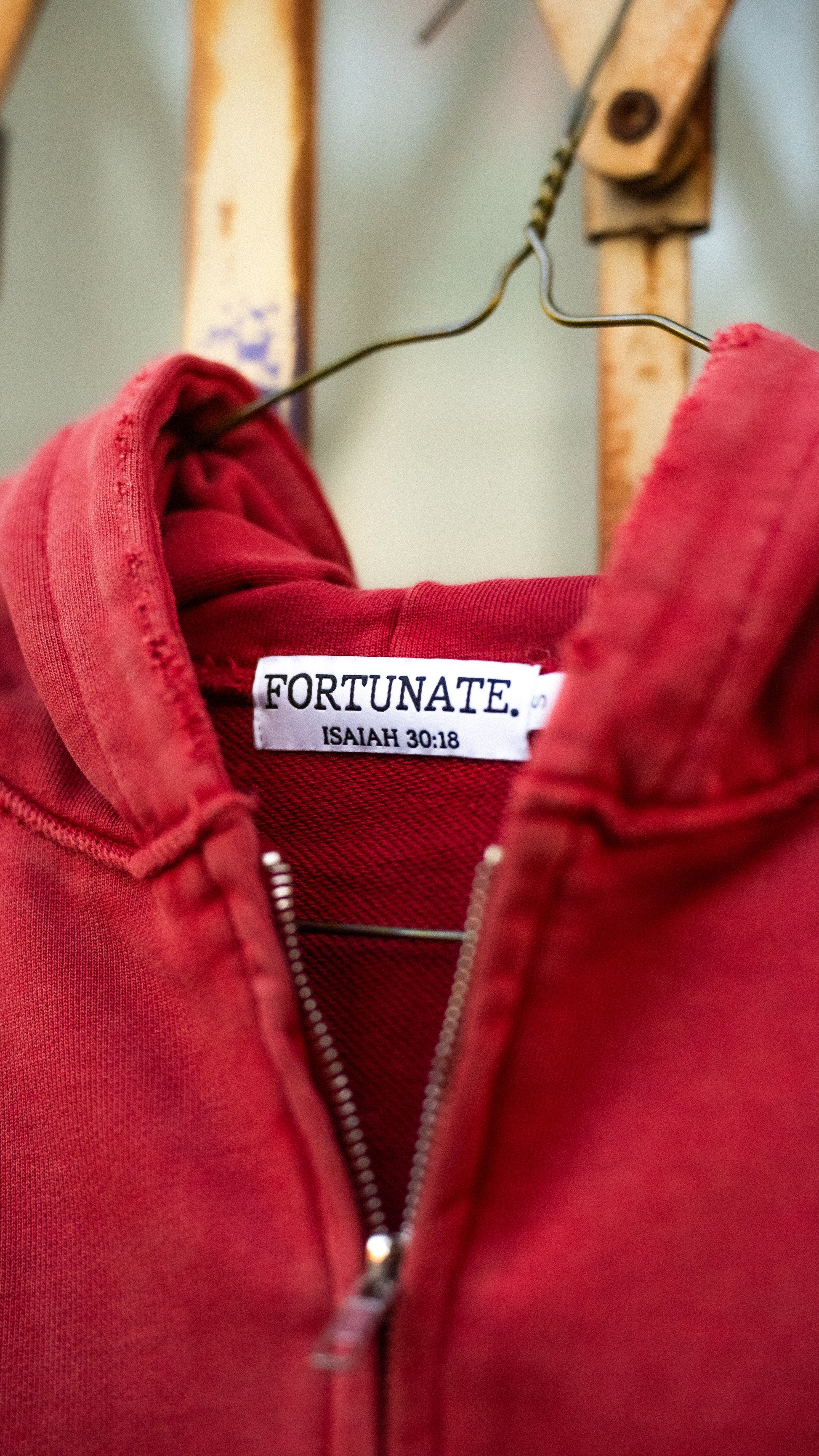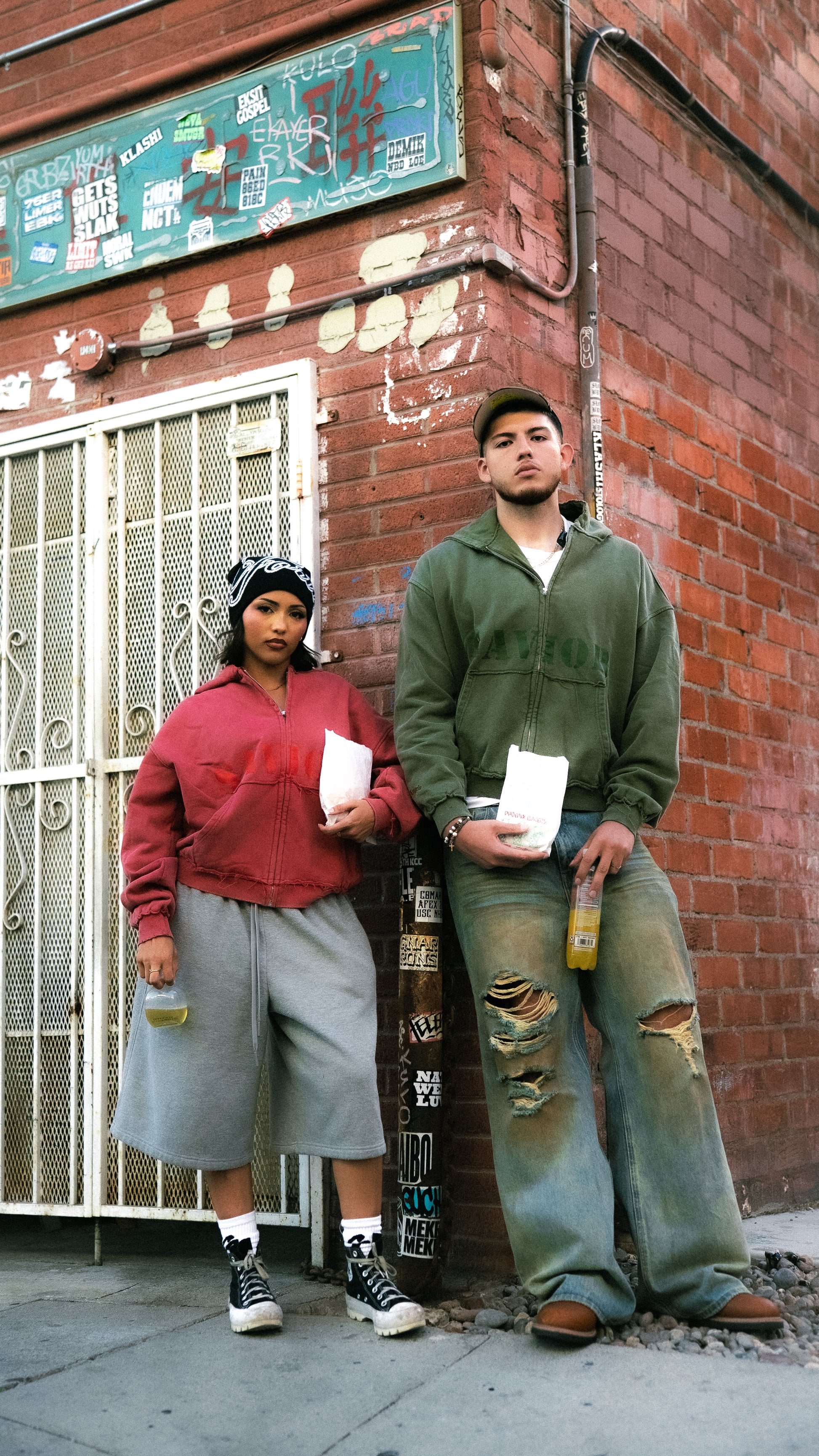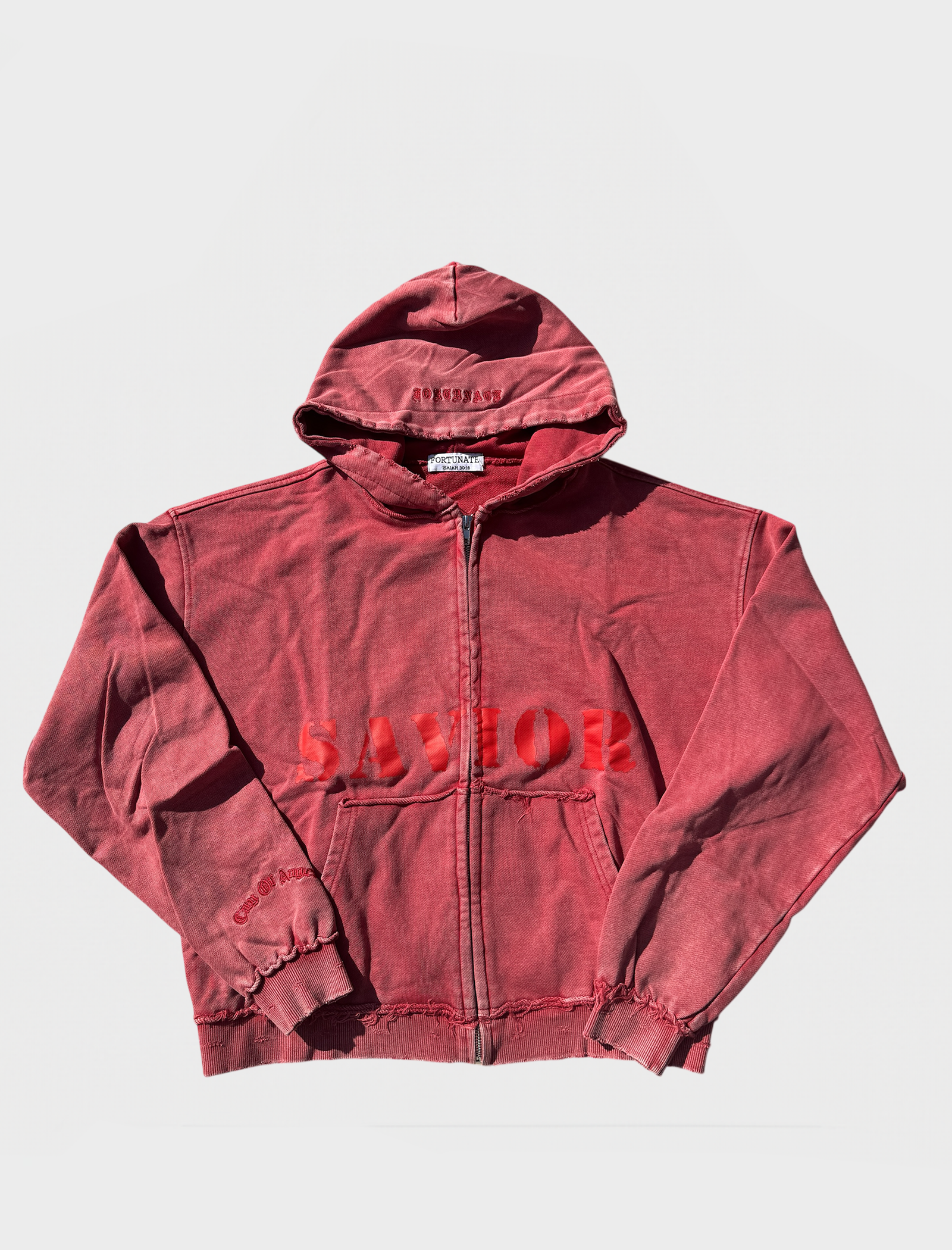 Introducing our second cut & sew zip up. The Zip features the word "Savior" across the center stomach. Followed by an embroidered "City Of Angels" on the right wrist. In addition it also has an embroidered "Fortunate" in the center of the hood. Cut and sewed to a refined boxy, cropped fit making our zip up an outerwear essential.